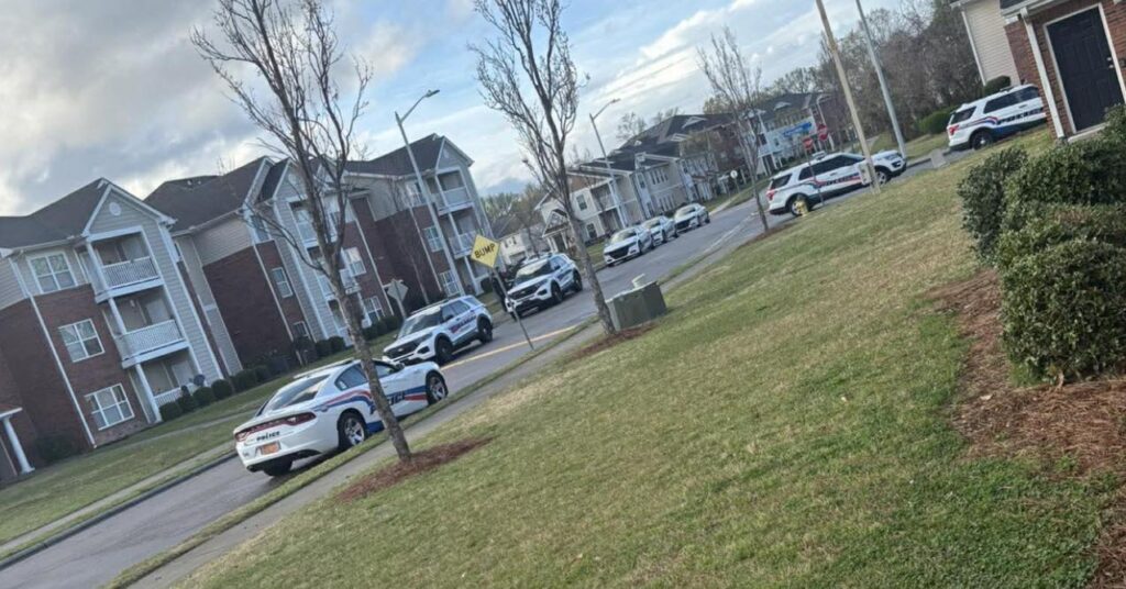 Multiple police units were observed throughout the area as officers conducted a search around an apartment complex and surrounding streets. Patrol vehicles were positioned along roadways while officers worked to secure the scene.