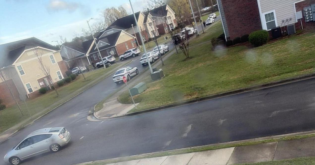 Multiple police units were observed throughout the area as officers conducted a search around an apartment complex and surrounding streets. Patrol vehicles were positioned along roadways while officers worked to secure the scene.