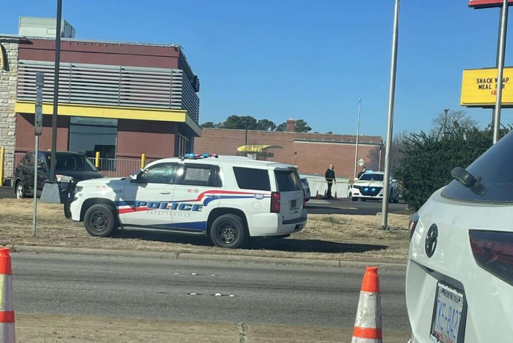 Fayetteville, NC — A heavy police presence was reported near 11:30 a.m. at the McDonald’s located on Skibo Road at Morganton Road. Multiple police units were observed positioned around the restaurant, with patrol vehicles surrounding several sides of the building and near the drive-through area. Crime scene tape was visible across portions of the parking lot.