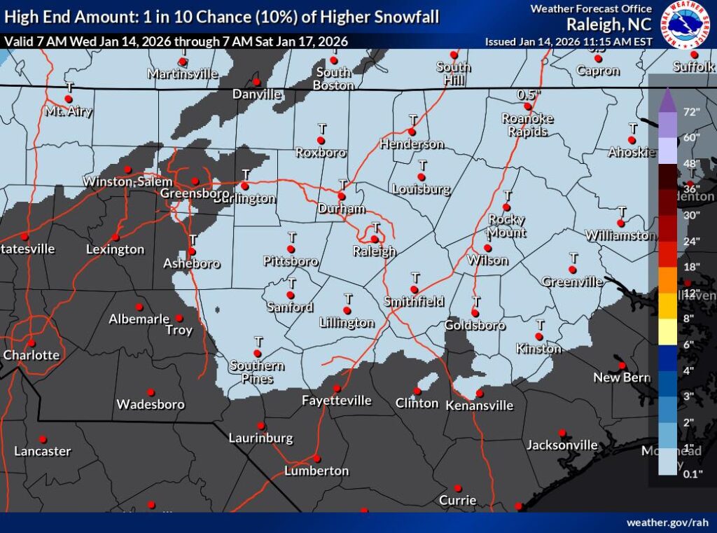 There is a low chance of snow flurries, estimated at around 8 percent, with any accumulation expected to be minimal — ranging from a trace to one-tenth of an inch at most. While widespread impacts are unlikely, a brief flurry or two cannot be ruled out. If temperatures remain slightly warmer, precipitation may fall as cold rain instead.
