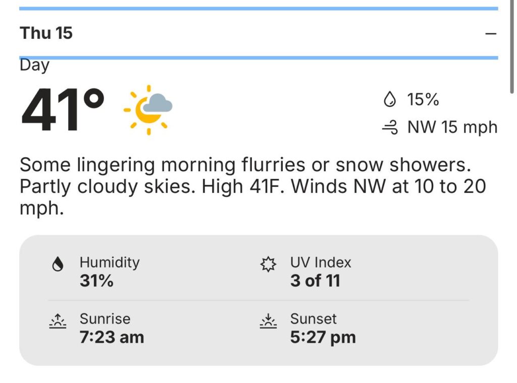 Overnight low temperatures are expected to fall to around 19 degrees. Thursday’s daytime high is forecast near 40 degrees, though some areas may remain slightly cooler. By Friday, temperatures are expected to rebound modestly, with highs near 45 degrees.
